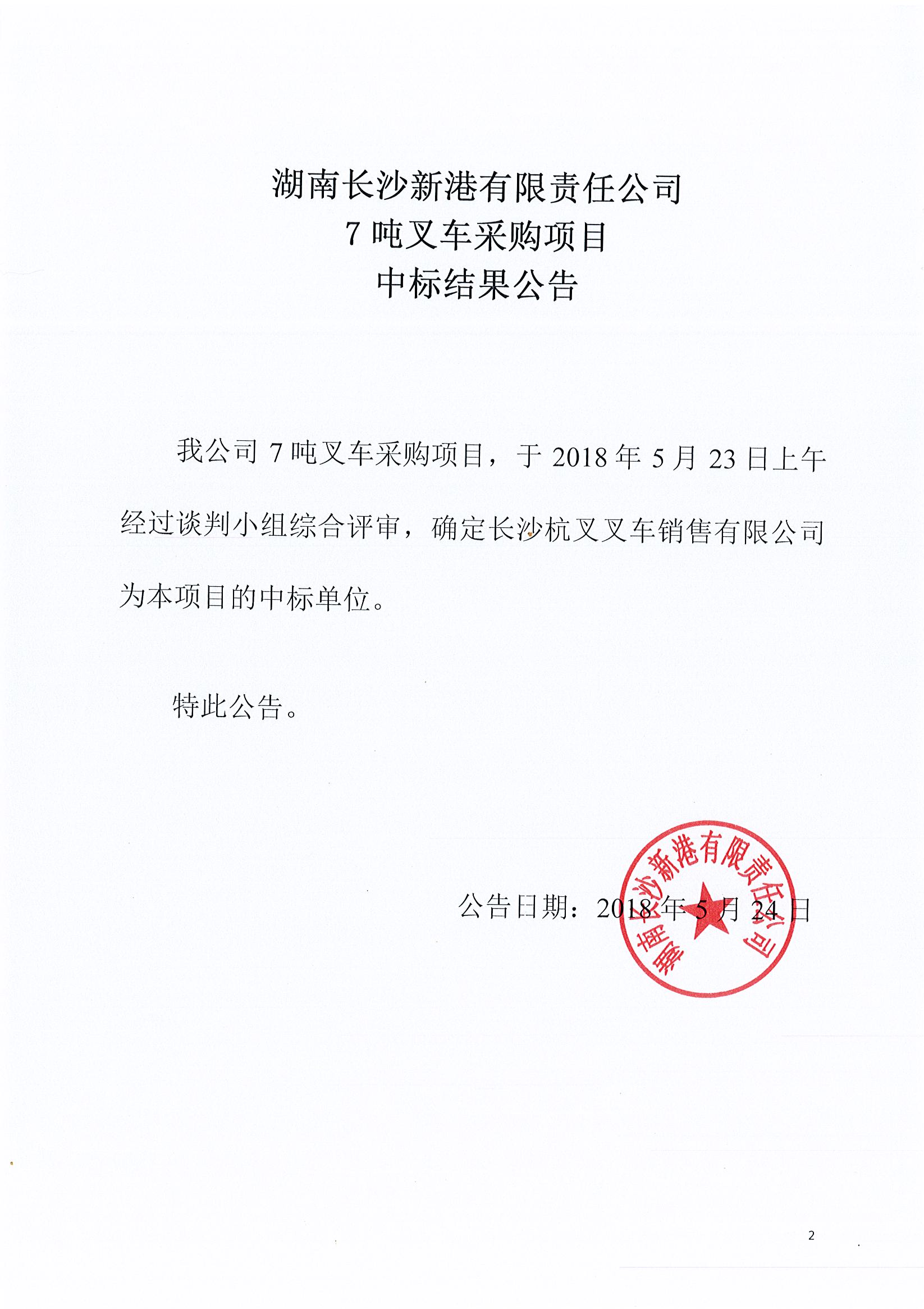 湖南長(cháng)沙新港有限責任公司 7噸叉車(chē)采購項目中標結果公告