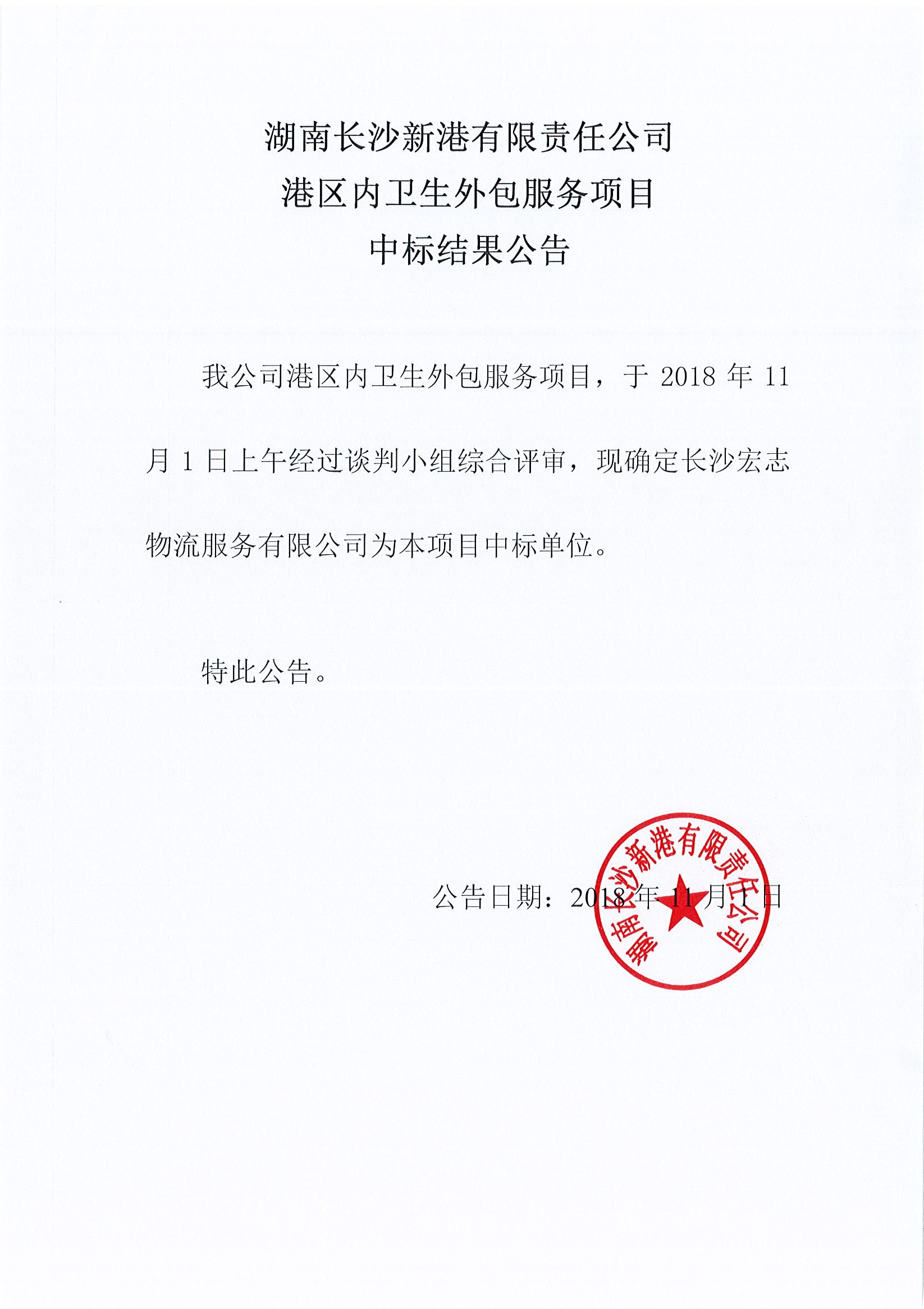 湖南長(cháng)沙新港有限責任公司港區內衛生外包服務(wù)項目中標結果公示