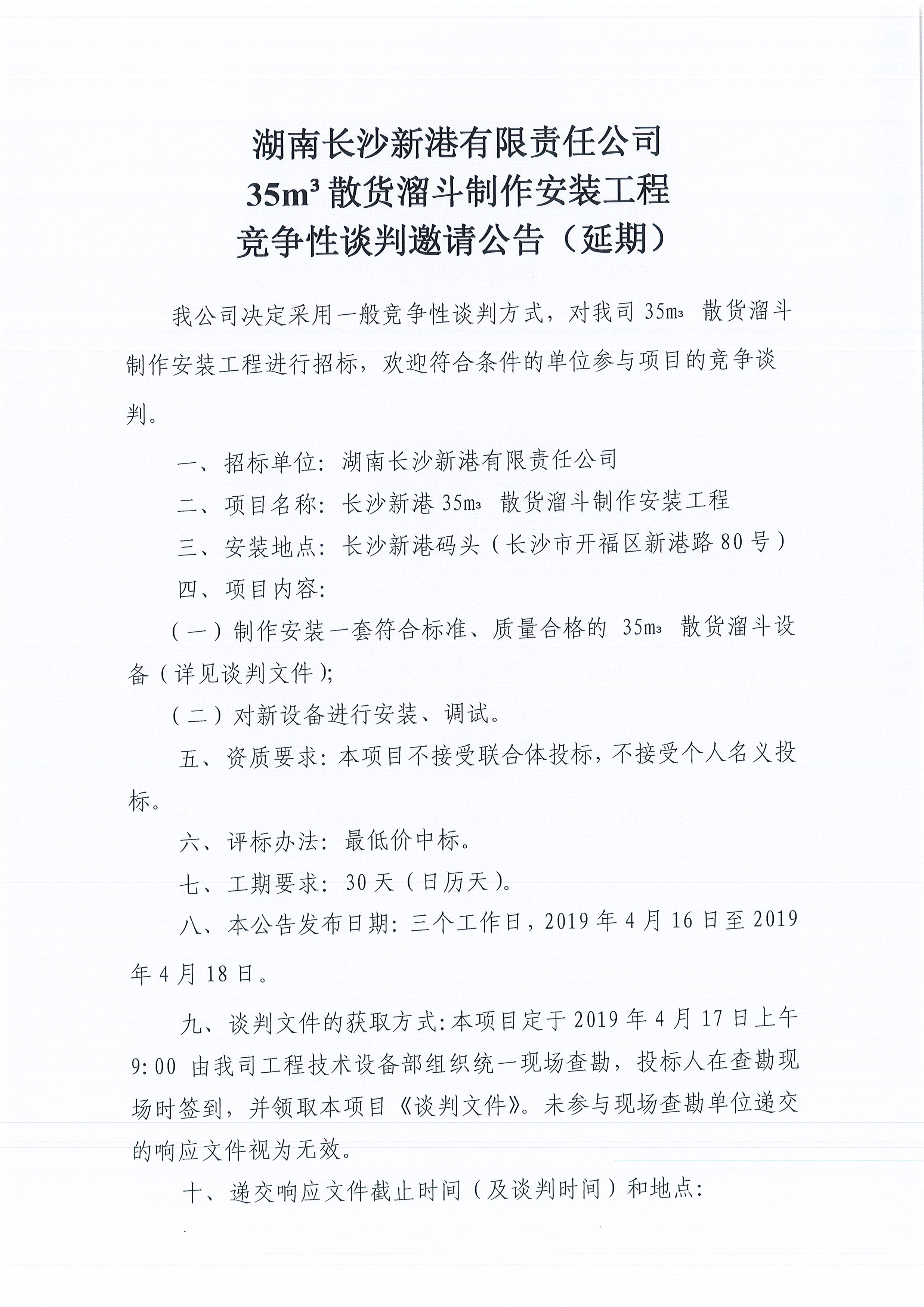 湖南長(cháng)沙新港有限責任公司35m³散貨溜斗制作安裝工程競爭性談判邀請公告(延期))