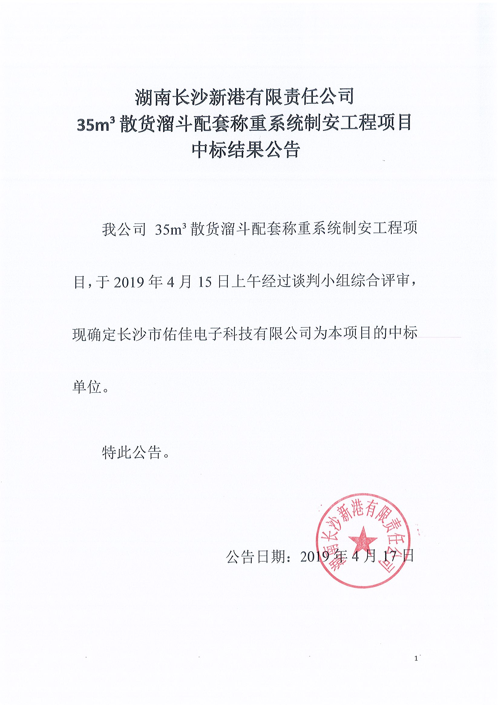 湖南長(cháng)沙新港有限責任公司35m³散貨溜斗配套稱(chēng)重系統制安工程項目中標結果公告