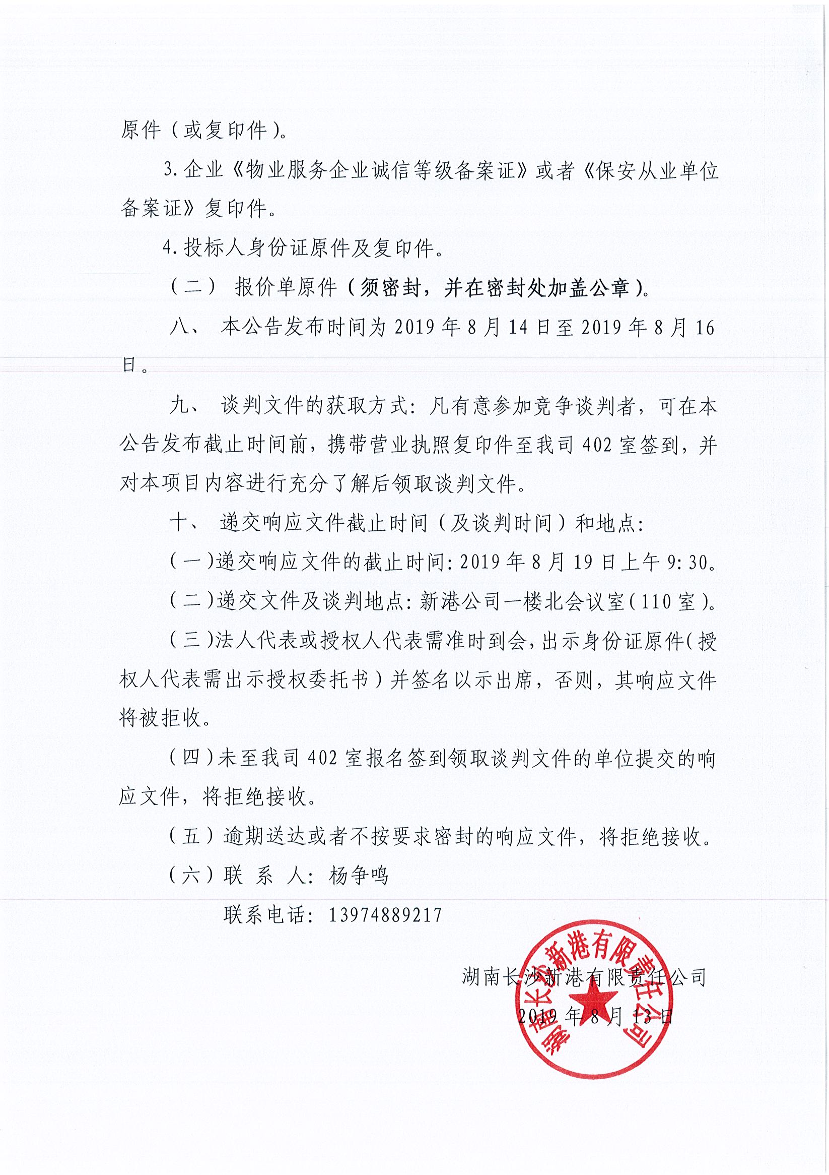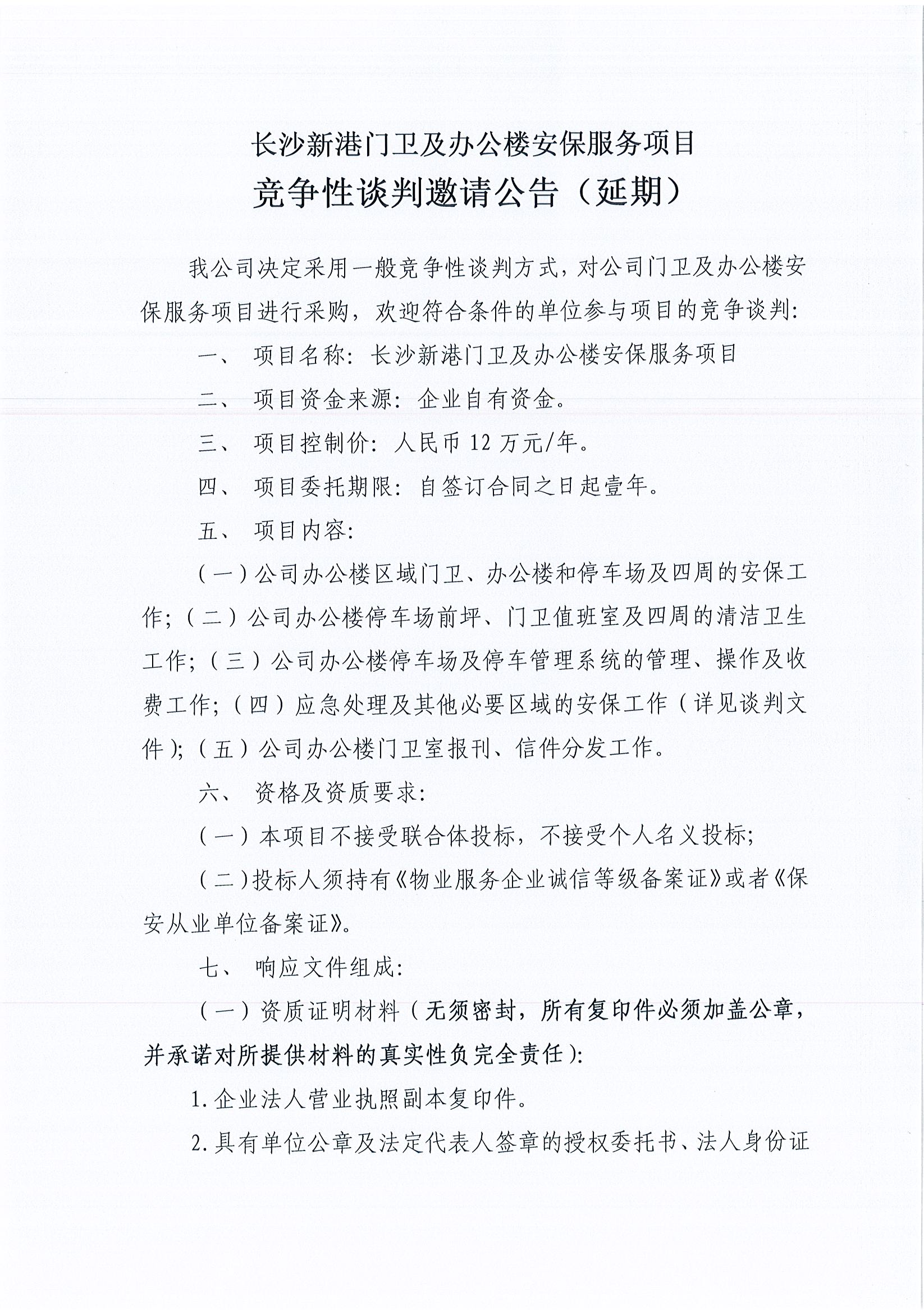 長(cháng)沙新港門(mén)衛及辦公樓安保服務(wù)項目競爭性談判邀請公告(延期)