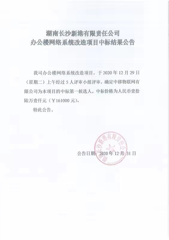 湖南長(cháng)沙新港有限責任公司辦公樓網(wǎng)絡(luò )系統改造項目中標結果公告