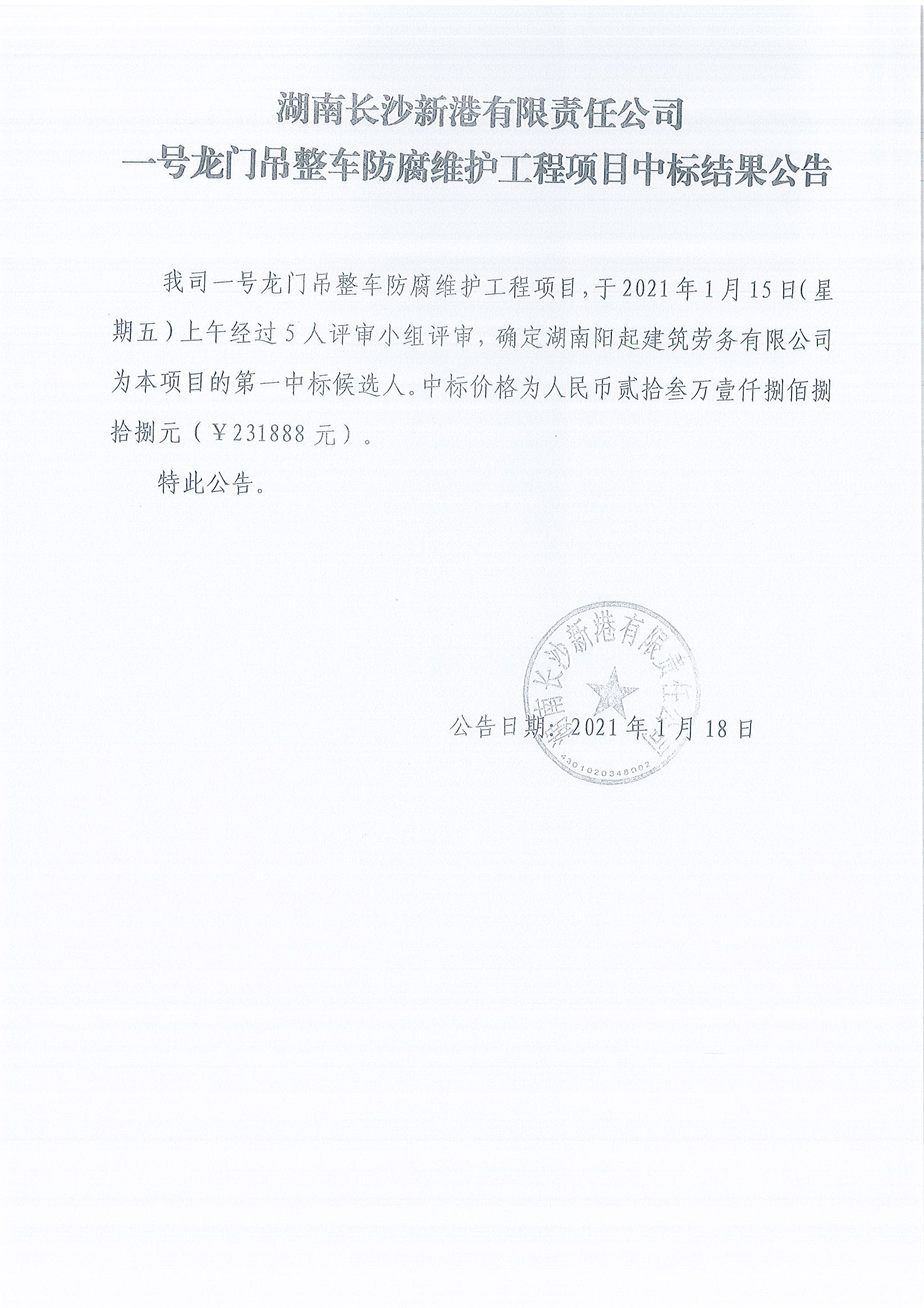 湖南長(cháng)沙新港有限責任公司一號龍門(mén)吊整車(chē)防腐維護工程項目中標結果公告