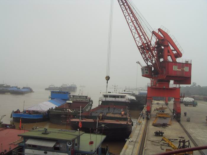 長(cháng)沙新港超高水位起吊貨物繁忙