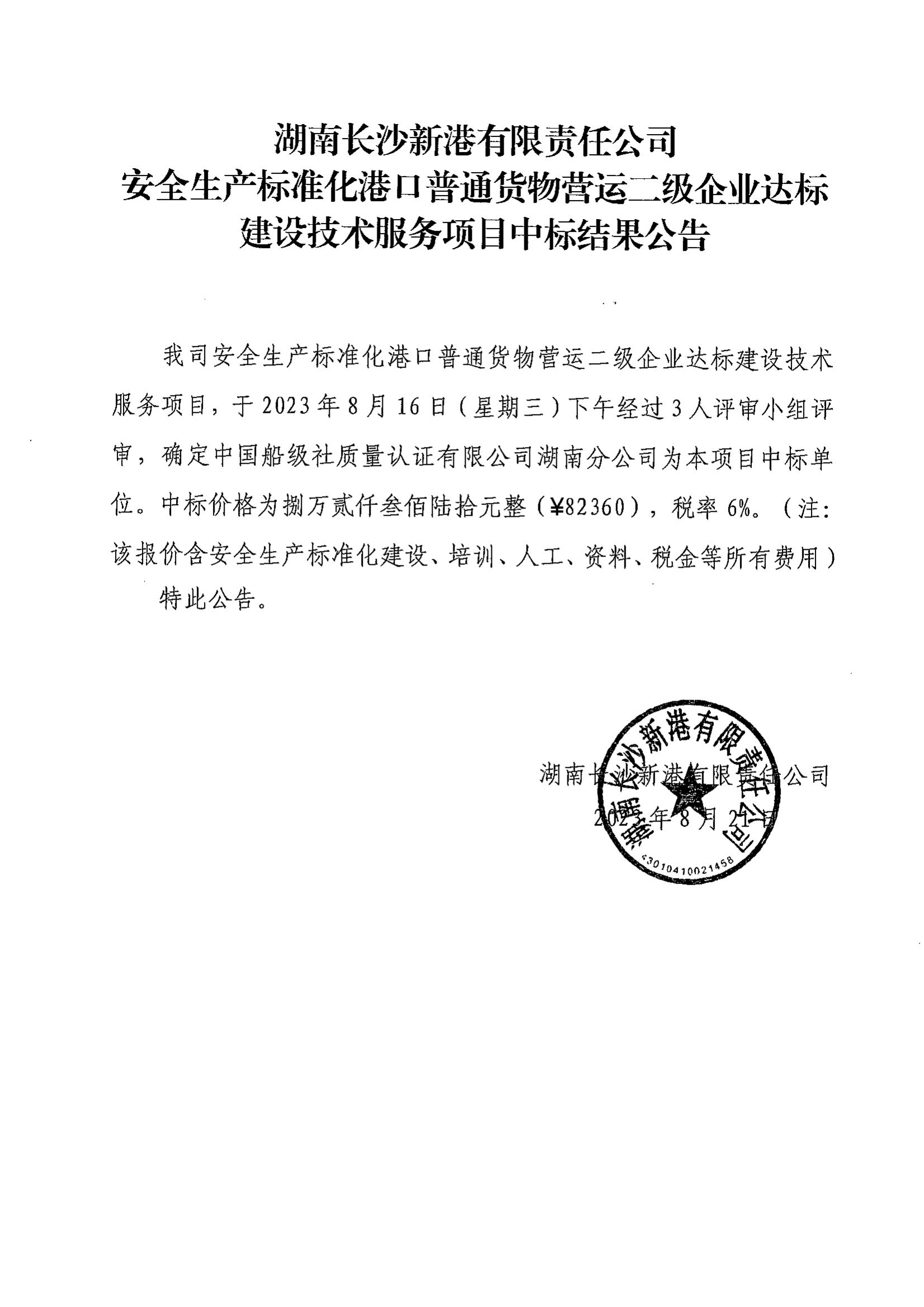 安全生產(chǎn)標準化港口普通貨物營(yíng)運二級企業(yè)達標建設技術(shù)服務(wù)項目中標結果公告