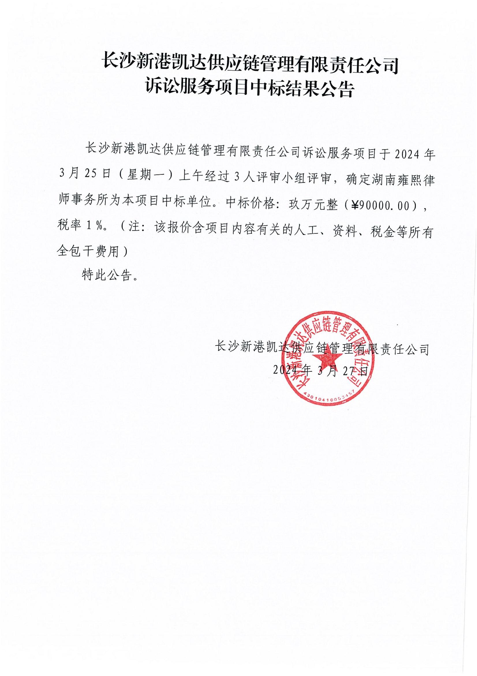 長(cháng)沙新港凱達供應鏈訴訟服務(wù)項目中標結果公告