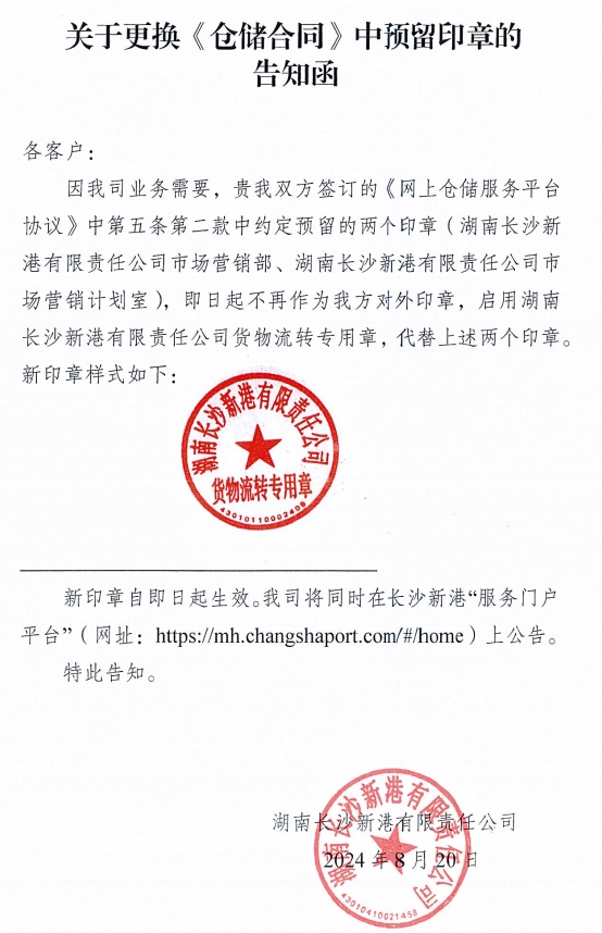 關(guān)于更換《倉儲合同》《網(wǎng)上倉儲服務(wù)平臺協(xié)議》中預留印章的告知函