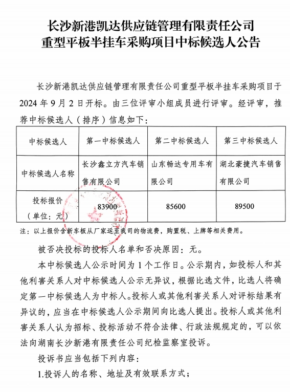 長(cháng)沙新港凱達供應鏈管理有限責任公司重型平板半掛車(chē)采購項目中標候選人公告