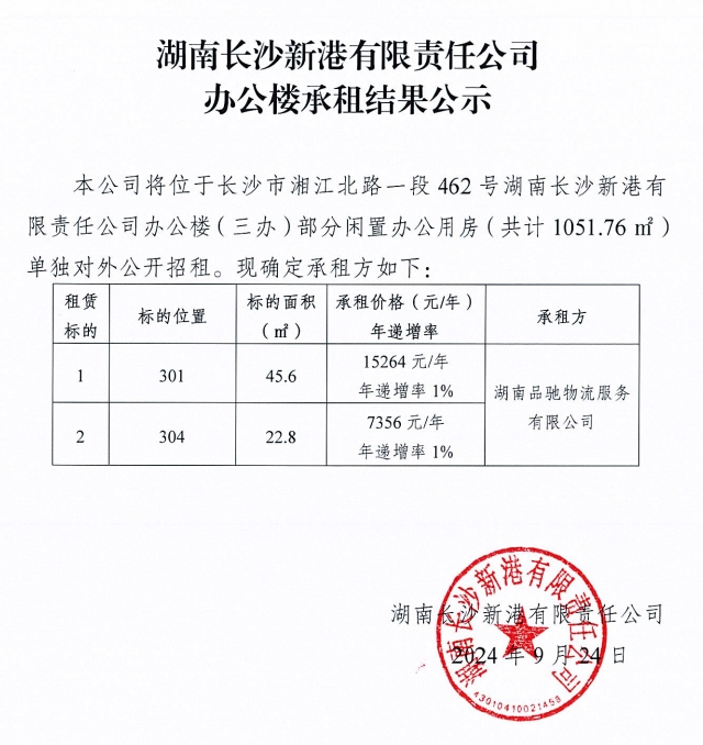 湖南長(cháng)沙新港有限責任公司辦公樓承租結果公示